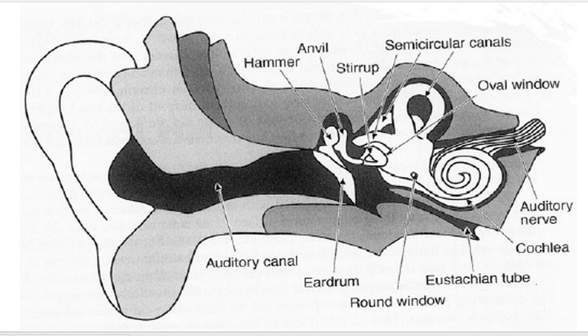 The depiction below illustrates the construction of the outer, middle, and inner ear (Hodges & Sebald 2011, p. 98).