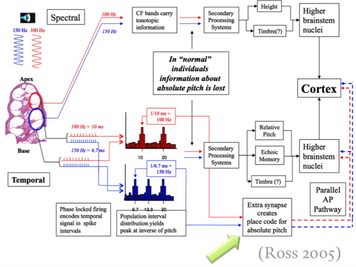In the chart above (provided by Dr. Quinn), Ross spells out the acoustical signal pathway to the Auditory Cortex. Pay special attention to the green arrow. Ross and Quinn both indicate that there is a special neural pathway that is specifically used to encode (chunking, schemata), rehearse, and store data having to do with AP. It is this special neural network within which the brain retrieves information in regards to instances where AP dependency is called upon. This information strongly suggests that AP is a genetically determined trait. Ross further concludes that both musicians and non-musicians (unable to name note names) with AP faired far better than their non-AP possessors throughout the study disproving the hypothesis that early musical training is required for the development of AP.